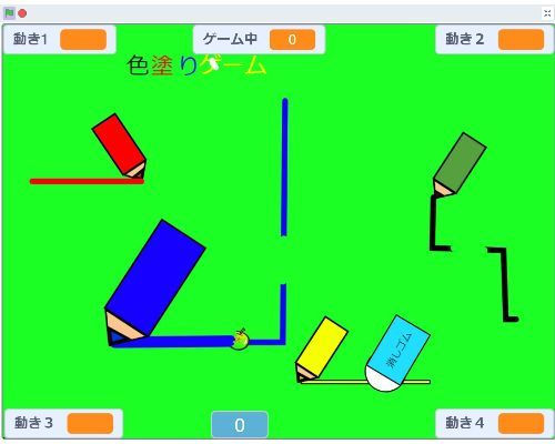 「えんぴつたちがアイテムを使って色をぬりあう4人用ゲームです。アイテムをいっぱい作ったところを工夫しました。」