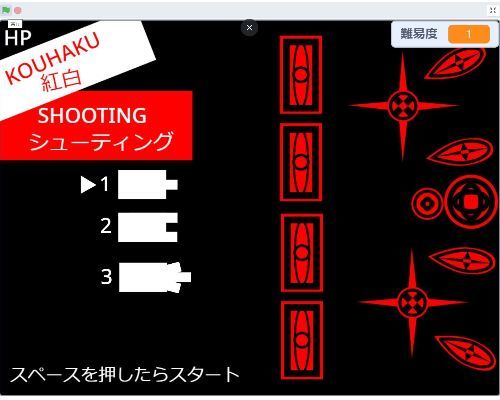 「赤対白のシューティングゲーム。スタート画面で機種を選べるようにした。キャラクターのデザインを操作キャラは白、敵キャラは赤と黒で構成し、シンプルでかっこいいデザインにした。」