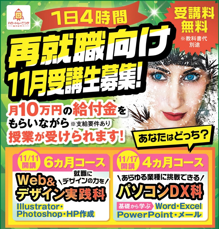 最新情報 20251010 【ライナー掲載】職業訓練11月受講生募集 20251010 【職業訓練】Web&デザイン実践科11月生募集中 20251010 【職業訓練】基礎から学ぶパソコンDX科11月生募集中 20250923 【プログラミング】お試し入会キャンペーン 職業訓練11月受講生募集中! 詳細はコチラから! 説明会申込はコチラから! お電話でのお問合せ(無料) 事業内容 開講から28周年のPCカレッジ!趣味・スキルアップ・資格取得・再就職・スマホ等、幅広い学習内容であなたの学びをサポートいたします。 職業訓練 就活とスキルアップが両立できる無料講座 転職・就職する前に、パソコンの基礎を学びなおしませんか?求職中の方なら全員受講料無料!officeソフトとデザインソフトの2種類のコースを開講しているのは道北でPCカレッジだけ!老舗パソコン教室のノウハウをデータに変え、旭川周辺での就職活動をサポートします。 職業訓練詳細 プログラミング講座 個性を伸ばすをモットーに、どんな子ものびのび学んでいます。 月謝コース 通う回数・曜日を選べる!パソコン・スマホをゆっくり学びます。 試験を受ける 各種認定試験の会場です。検定日や会場案内等 無料職業紹介事業 このたび、無料職業紹介事業を開始しました。これにより、求職者の方々に対し、適性やスキルに合った職場をご紹介し、就職活動をサポートいたします。今後も、より良い雇用の機会を提供できるよう努めてまいります。 ▼求人紹介受付中!連絡はこちらから!▼ 電話をかける お問い合わせ