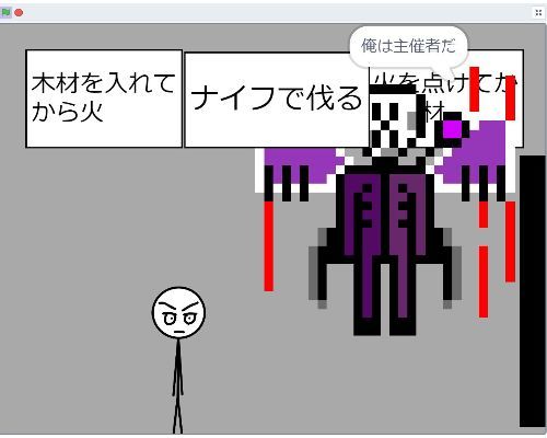 「操作方法:矢印キー。謎解きが少し入っている。途中途中インベントリが見れるようにした。初見は終わり方がわからない。拾った物や答え方でEndが変わる。」
