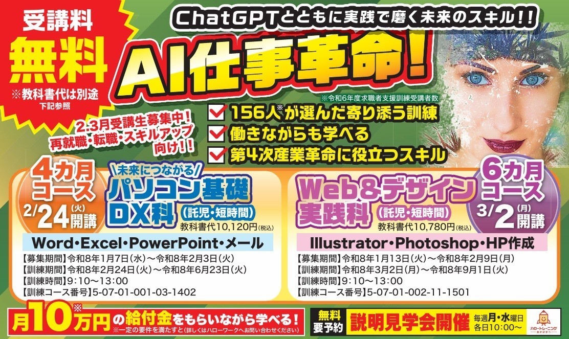 Illustrator・Photoshop・ホームページ制作など、これからの仕事に役立つスキルを、基礎からしっかりと学べる講座です。未経験からでも安心してスタートでき、プロの講師によるサポートや、修了後の就職支援も充実しています。